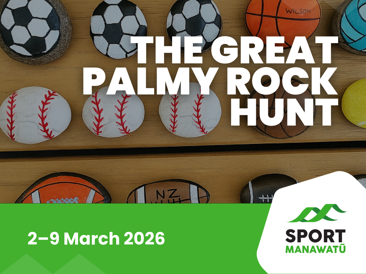 From 2 – 9 March 2026, colourful sport themed rocks are hiding across eight of Palmy’s parks and reserves. Can you find them all?